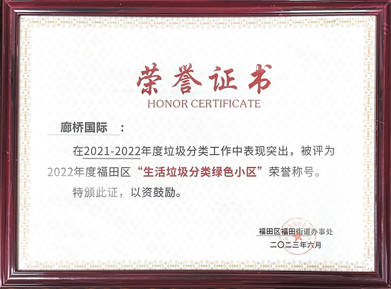 近日,国贸美生活公司廊桥国际效劳中心荣获福田区2022年“生活垃圾分类绿色小区”荣誉称呼。