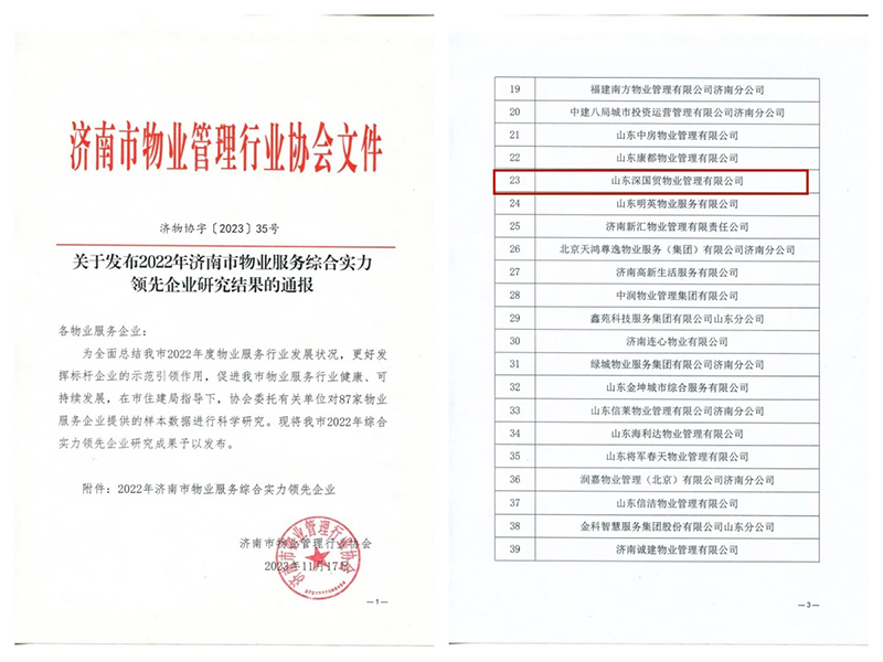 近日,《2022济南物业治理行业年鉴》(以下简称《年鉴》)正式宣布,山东深国贸公司荣获“济南市物业效劳综合实力领先企业”“济南市物业效劳行业履行社会责任领先企业”两项荣誉称呼 。