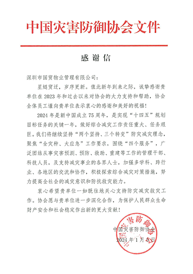 其中,中国灾害防御协会向国贸物业赠《谢谢信》一封,对国贸物业一直以来大力支持和资助协会开展灾害防御事情体现了谢谢;国贸科技园公司深圳会展中心项目划分获中国(深圳)国际秋季茶工业博览会组委会“精准效劳,以客为主”锦旗一面、中国国际高新技术结果交易会组委会《谢谢信》一封,就高标准、全方位、精细化的安防效劳,向公司及项目全体成员表达谢谢与赞扬。