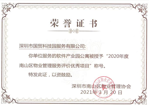 近日,深圳市南山区物业治理协会召开表扬大会,国贸科技园工业园分公司软件工业基地项目及生态园项目四区荣获“2020年度南山区优秀防疫项目”、软件工业基地项目荣获“2020年度南山区物业宁静优秀项目”、软件工业园公寓获评“2020年度南山区物业治理效劳评价优秀项目”等荣誉称呼。