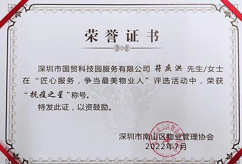 2022-08-29国贸科技园公司员工获评“抗疫之星”荣誉称呼近日,深圳市南山区物业治理协会开展“匠心效劳,争当最美物业人”评选表扬运动,国贸科技园工业园分公司生态园项目一二区员工符庆洪凭借兢兢业业、任劳任怨的事情态度和作风,获评“抗疫之星”荣誉称呼。