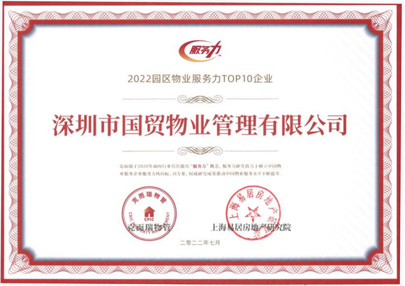 2022-08-09国贸物管公司荣获“2022物业效劳力百强企业”等多项荣誉近日,上海易居房地产研究院、克而瑞物管联合主办2022中国物业效劳力百强峰会,宣布2022物业效劳力系列测评结果。国贸物管公司凭借优秀的物业效劳力及现场治理能力,荣获“2022物业效劳力百强企业”、“2022园区物业效劳力TOP10企业”、“2022年度效劳力标杆项目”等多项荣誉。 -