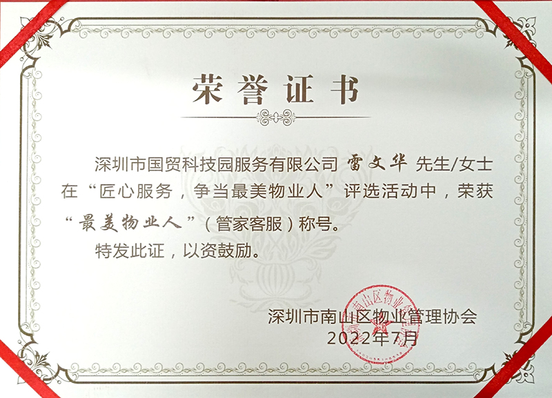 2022-08-19国贸科技园高新分公司员工荣获“最美物业人”、“抗疫之星”称呼近日,深圳市南山区物业治理协会开展“匠心效劳,争当最美物业人”评选表扬运动,国贸科技园高新区分公司工业村治理处雷文华凭借过硬的业务能力和专业效劳水平,荣获“最美物业人”(管家客服)和“抗疫之星”称呼。 -
