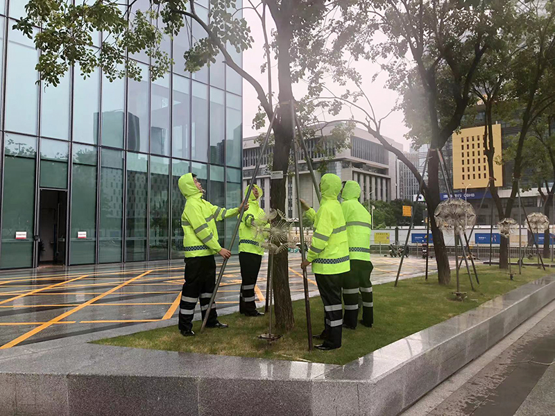 国贸科技园公司牢牢筑起园区防地,一是增强巡视,对园区易渗水点和下水道进行全面细致排查和处理,包管下水道通畅,防患于未然;二是在所有大门及低洼易淹水的地方垒起沙袋,最大限度阻止雨水进入室内;三是提前加固外围设备,实时修剪园区乔木枯枝,全天候监控所有区域,增加巡逻频次,确保第一时间处理突发状况。