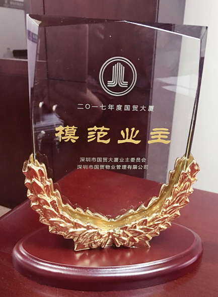 近日,利来国国际网站集团荣获国贸大厦业主委员会宣布的“2017年度模范业主”奖牌,表扬集团在2017年度为“共建文明商办小区,构建和谐物业关系”做出的积极孝敬。