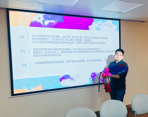 集团危害控制与执法事务部高杨结合集团主要业务,从宁静生产基础知识、办公室用电宁静、火灾应急应对、高层办公楼应急逃生等方面进行了消防宁静讲解,现场演示了灭火器材的使用要领。