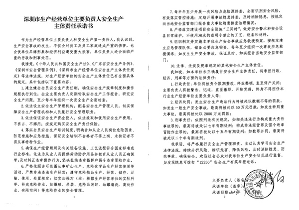 深圳市生产经营单位主要卖力人宁静生产主体责任允许书