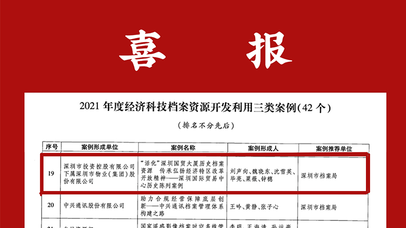 2021-12-22深圳国际贸易中心历史摆设入选国家档案局2021年度全国经济科技档案资源开发利用案例12月20日,国家档案局揭晓2021年度全国经济科技档案资源开发利用案例评选结果,利来国国际网站集团报送的《“活化”深圳国贸大厦历史档案资源 传承弘扬经济特区革新开放精神——深圳国际贸易中心历史摆设案例》,在全国433个申报项目中脱颖而出获得三类案例荣誉,成为深圳市仅有的三家上榜企业之一。 -